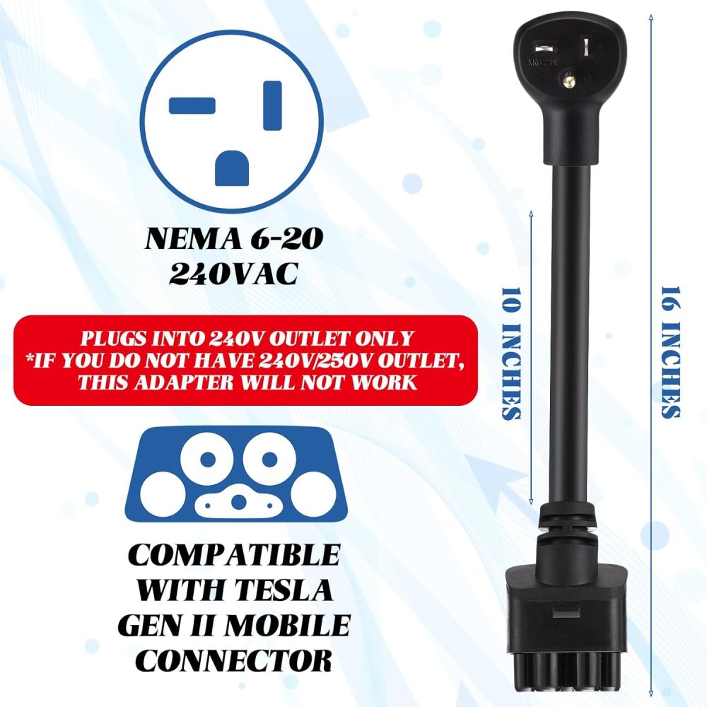 Introducing the 16″ 6-20 Adapter Compatible with Tesla Gen 2 Mobile Portable Charger! This adapter allows you to easily connect your Tesla Gen 2 Mobile Portable Charger to a 240V 6-20P outlet, providing you with the convenience of charging your vehicle at 16 amps. The adapter features a sturdy handle for easy handling and use….